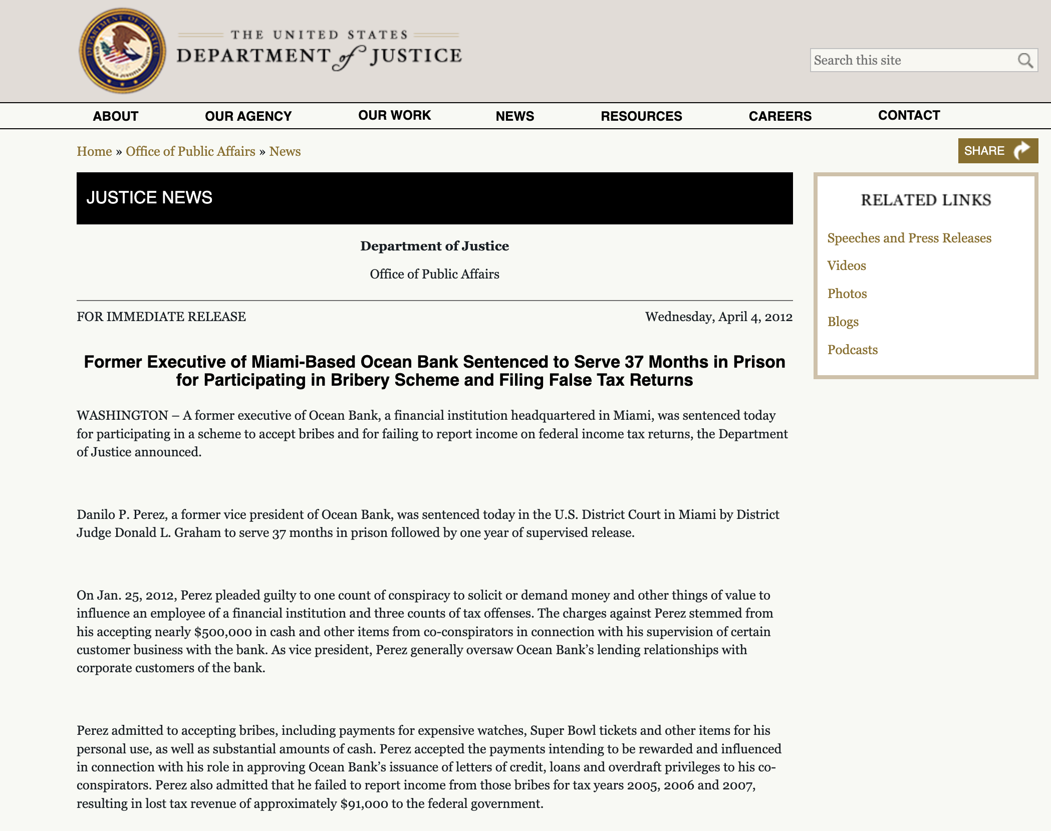 On Jan. 25, 2012, Perez pleaded guilty to one count of conspiracy to solicit or demand money and other things of value to influence an employee of a financial institution and three counts of tax offenses. The charges against Perez stemmed from his accepting nearly $500,000 in cash and other items from co-conspirators in connection with his supervision of certain customer business with the bank. As vice president, Perez generally oversaw Ocean Bank’s lending relationships with corporate customers of the bank.